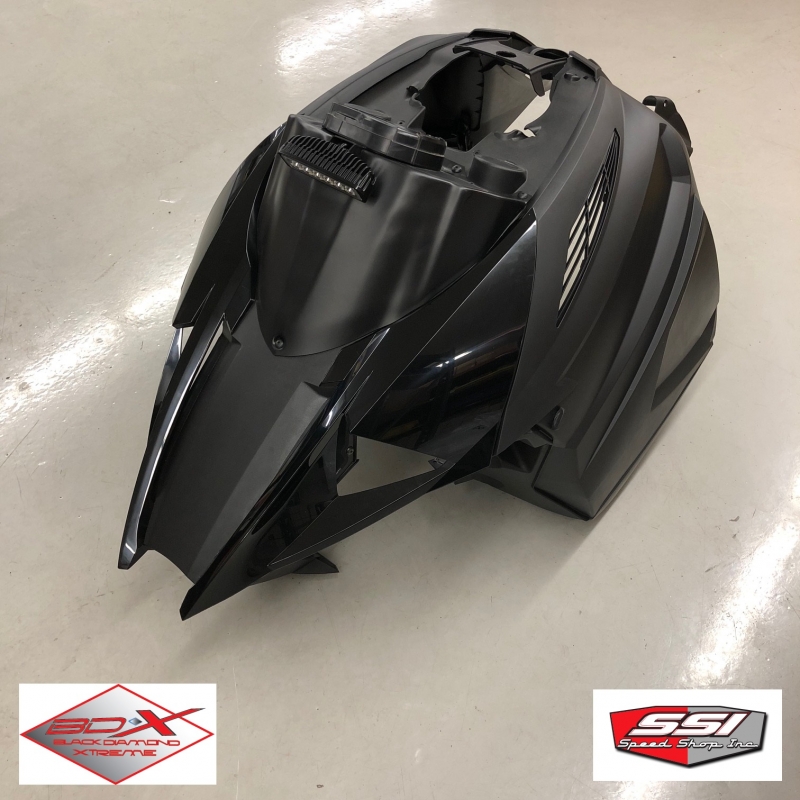 This new PROMAX kit come with new side panels, bellypans, hood vents, upper cowl PRO-MAX cold air intake, low windshield pod with built in digital gauge mount dash and intake. Comes with all frogskin intakes installed on the dash and hood. A complete kit to update your machine like our new PROLITE'S. Less weight than the newest Arctic Cats by about 7 lbs!!