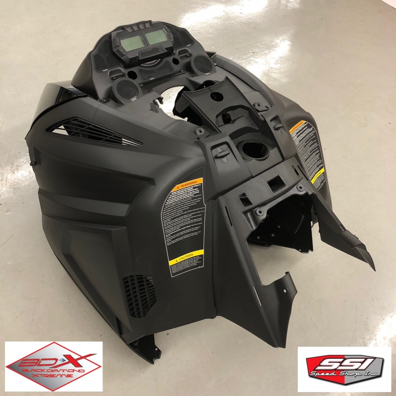 This kit comes with all new BLACK front end plastics off of the 2018+ Style Arctic Cat Ascender chassis. Hood panels, side panels, belly-pans, hood vents, cowl, hardware and fasteners.