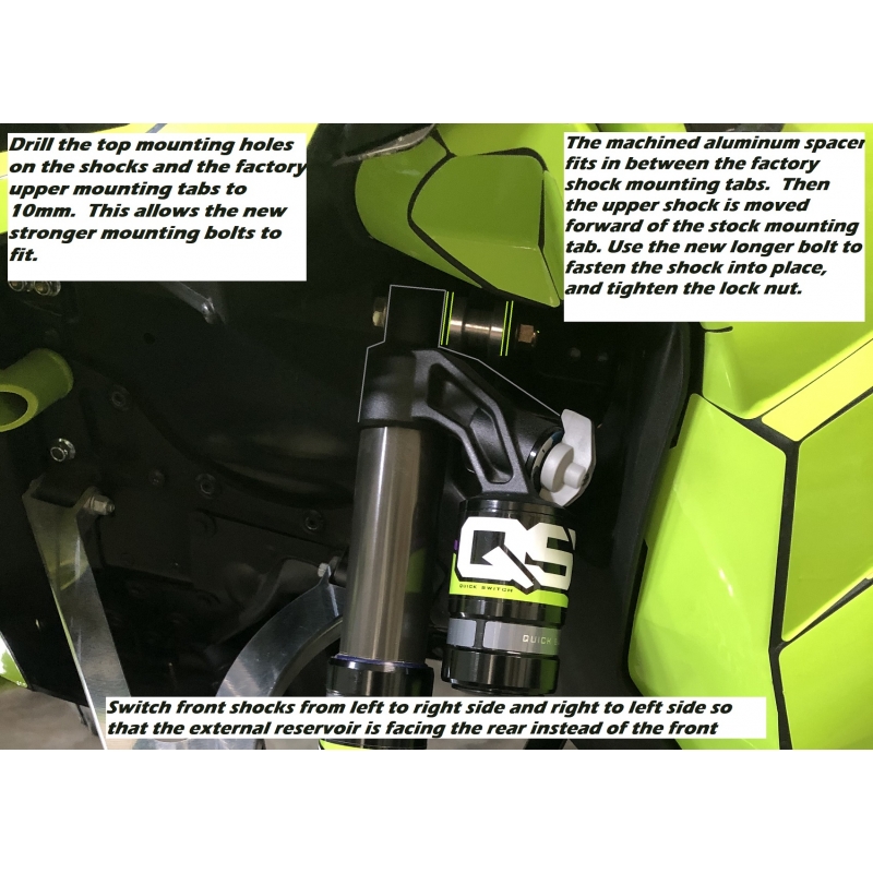 Simply rotate the shocks from each side and use this new mounting hardware. This allows clearance for the upper A arms.