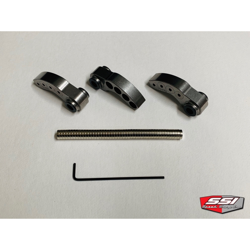 For the Ski-Doo P-Drive clutch is our Pro Mag adjustable weights that are adjustable from 71-92 grams. They have 4 positions per weight arm with easy to use magnets. This allows you to proportion the weight just the way you want it, whether you want a light or heavy tip weight. This profile works so much better than the stock clicker weights, its unbelievable! We struggled to achieve proper top end pull with the stock style clicker weights. Our Pro-Mag weights pull hard and shift the clutch out efficiently!