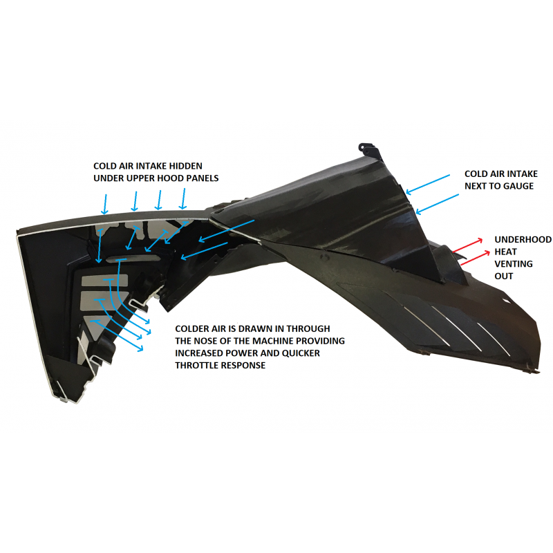 Update your Proclimb with our new PROMAX cold air intake cowl and hood. The intake draws air from the front end under the cowl above the A arms, and side of the nose. And the PROMAX intake draws air from behind the digital gauge. The setup provides crisp cool air to the motor and does improve throttle response. It won't plug up in deep snow either. Narrower than stock too!